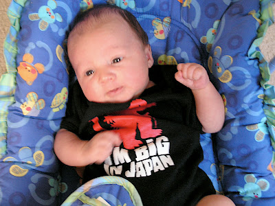 Secondly, if you've ever thought about using cloth diapers, wander over to wmw's site to see her apt blog about why its important, and how easy it is. I expect another installment soon talk about what she's using, if you all are very good. Our journey into cloth diaper land is going well, even with Tobo's nasty rash. He looks much better, but we're still waiting for it to go away completely. I got my fun toys in the mail this week, so we have new covers and a new pocket diaper to try out as soon as he's done using the cod oil based cream OR I figure out where I can get bioliners on the cheap. The closest retailer is in Boulder and I'm trying to decide if it's worth the gas or just have some internet store ship it to my door. I'm also thinking about switching to cloth wipes as well since we go through so many. We've given up on regular baby wipes since he's skin is so sensitive. We're now just using water and cotton squares. (like for make up) Oh and baths to keep little boy from becoming disgusting. He's still not really interested in toys at all, really likes being held, will tolerate being put down if it's only for a short time, hates(!) the floor, also hates(!) being naked. He managed to stay awake in the sling a whole 5 minutes a few days ago. Usually it just turns him into butter.