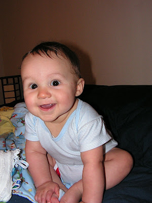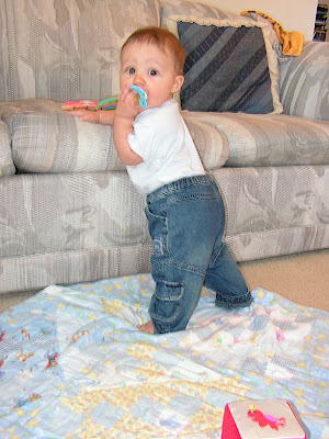 So tobo has gotten a few new habits over the last few weeks. One has basically started in the last day or so. He now likes to stand leaning against the couch, with one hand reaching for things. We put him up there, mainly because he whines when he's just sitting around. He did the same thing when he'd be on his back and wanted to sit up, and sitting, he wanted to stand. I forgot that you can't turn movies, so I accidently filmed this sideways: